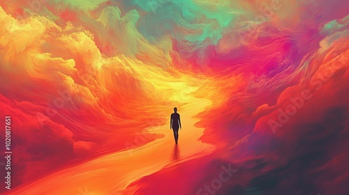 © Sirilak, Obraz premium A silhouette walks through a vibrant, colorful cloudscape.