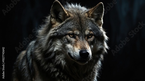 © NafisaNajmin, Fototapeta premium A silhouetted figure of a wolf with a dense, fluffy coat stands against a dark background