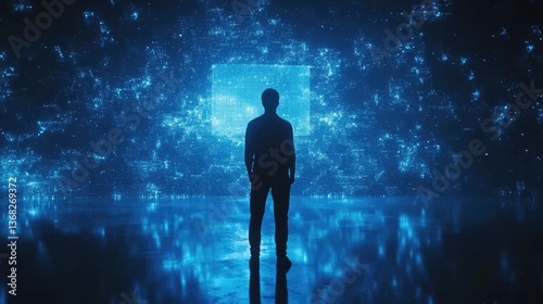© Seno, Fototapeta premium A silhouetted figure stands before a glowing digital interface, immersed in a futuristic, tech-inspired environment