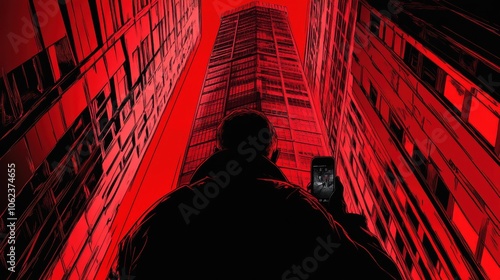 Fototapeta premium A silhouetted man gazes at a skyscraper, amidst dramatic red tones and...