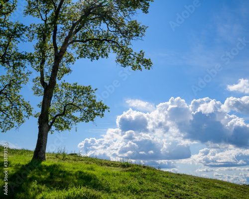 Obraz premium A silhouetted oak tree on a green hill with clouds and blue sky in the...