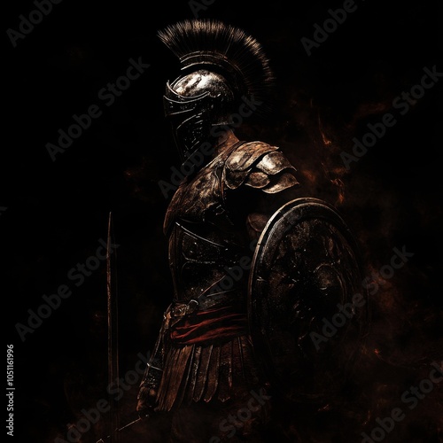 © Teerasit, Fototapeta premium A silhouetted Spartan warrior with sword and shield in a dramatic pose.