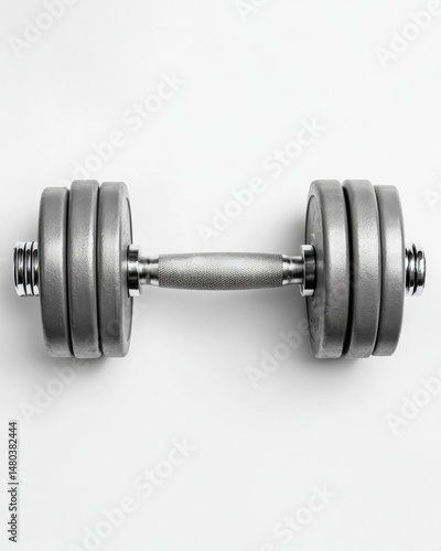 © Espresso, Naklejka premium A silver adjustable dumbbell with a textured grip on a clean, light background.
