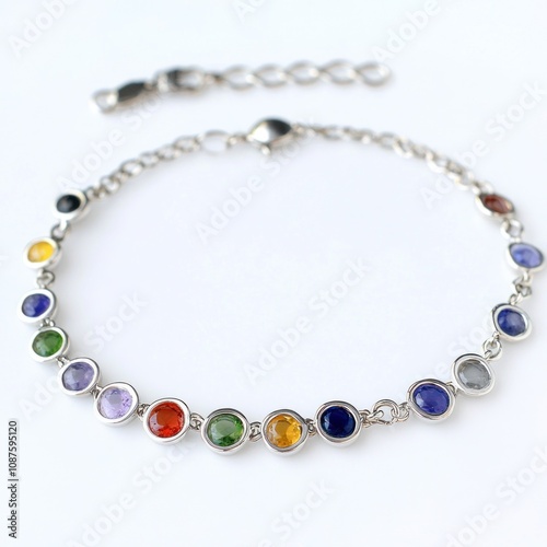 © Trionorejo, Obraz premium A silver bracelet adorned with colorful gemstones, showcasing a vibrant design.