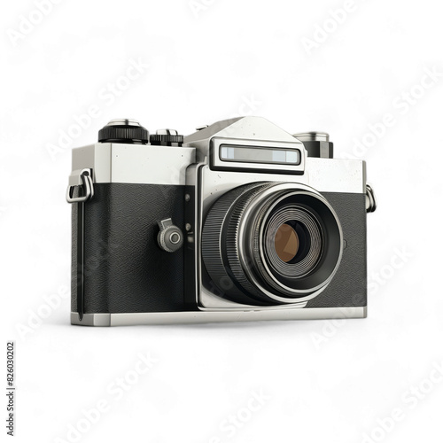 © Tirawat, Fototapeta premium A silver camera with a black lens sits on a white background, isolated on transparent background, PNG.