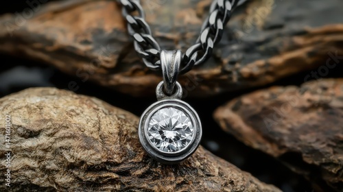 Fototapeta premium A silver chain necklace with a round diamond pendant rests on textured rocks.