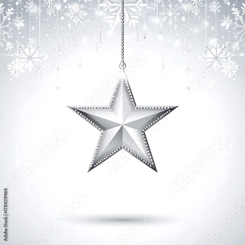 Fototapeta premium A silver, five-pointed star hangs from a chain against a background of gently falling snowflakes and sparkling lights. The design evokes festive joy