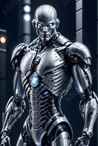 © MHJOARDERMRIDUL, Naklejka premium A silver ironic cyborg with blazing eyes standing in a dark spaceship hallway.