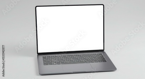 Fototapeta premium A silver laptop is open, displaying a blank white screen, against a plain light background.