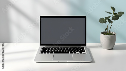 Fototapeta premium A silver laptop with a dark screen sits on a white desk next to a small potted plant. Soft light casts shadows. Minimalist aesthetic.
