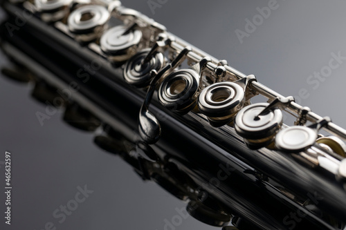 © Janisphoto, Naklejka premium A silver plated flute with keys on a dark reflective surface