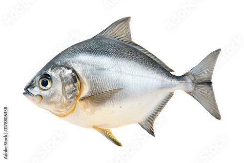 Naklejka premium A silver Pomfret fish with striking details of fins and scales isolated on...