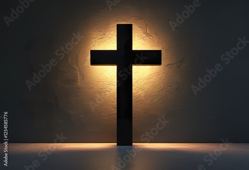 © JetHuynh, Naklejka premium A simple, backlit cross stands against a dark textured wall, illuminated by a warm light. The scene evokes feelings of faith, hope, and spirituality
