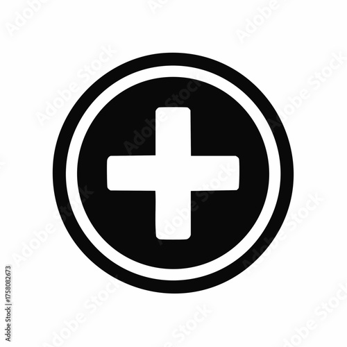 Fototapeta premium A simple black and white circular icon featuring a white plus sign in the center