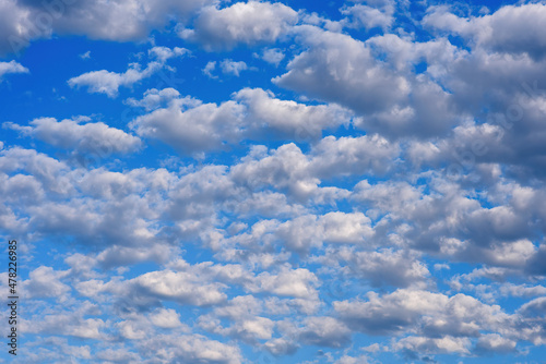 © Adam Calaitzis, Obraz premium A simple blue sky background with fluffy white clouds