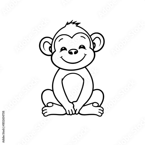 © Rana, Fototapeta premium A simple cartoon monkey with rounded features and a cheerful expression, sitting cross-legged with its hands placed on its knees, is centered in the frame, drawn with bold black outlines on a clean wh