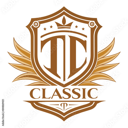 Fototapeta premium A simple, classic logo featuring the letters TI in a gold shield with a crown on top and wings behind the shield, Create a clean and understated logo featuring a timeless font