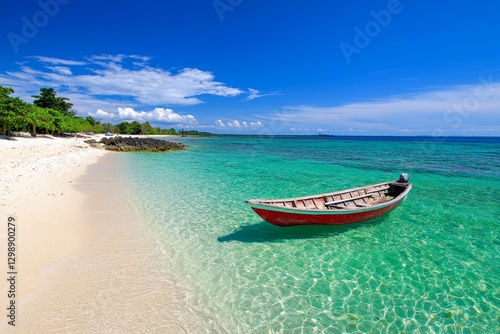 © Sanchai, Naklejka premium A simple, clean horizon where the deep blue sea meets the sky, with a tiny boat in the distance