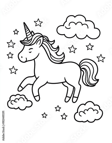 © Kitty, Fototapeta premium A simple coloring book page for children, featuring a cute little unicorn with clouds and stars in the background.