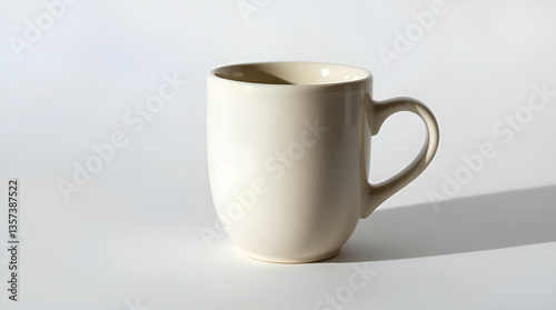 Fototapeta premium A simple, elegant off-white mug, perfect for a quiet morning, sits bathed in soft sunlight against a clean white backdrop.