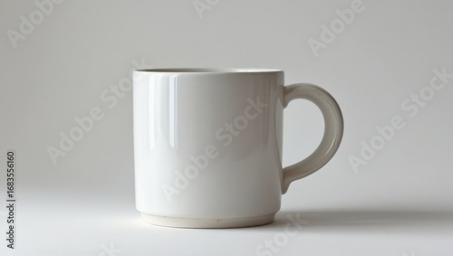 © SITI, Fototapeta premium A simple, elegant white ceramic mug with a subtle, textured handle sits on a plain background.