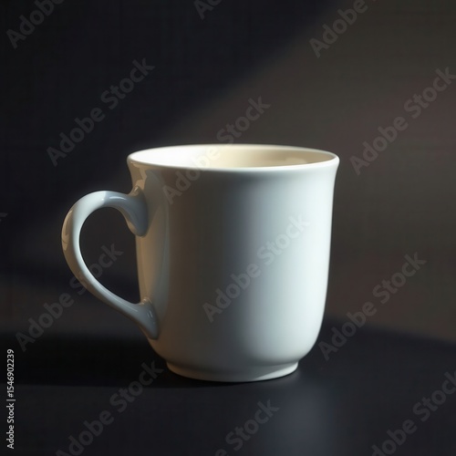 © Ardi, Fototapeta premium A simple, elegant white mug sits on a dark surface, softly illuminated by a gentle light source.