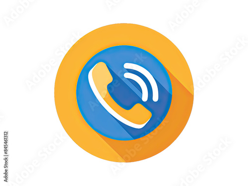 © md-SK, Fototapeta premium A simple icon of a yellow phone receiver with white waves in a blue circle, surrounded by an orange circle. The icon has a long shadow on a white background. Generative AI