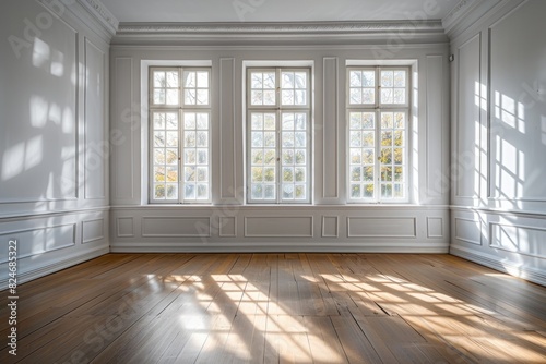 © Fotograf, Obraz premium A simple image of an empty room with three windows. Suitable for various interior design concepts