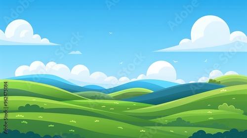 Fototapeta premium A simple landscape illustration of rolling green hills with a blue sky and fluffy white clouds, using soft gradients and flat design elements. 8k UHD, suitable for high-quality printing or digital
