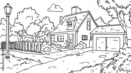 © Miftahul, Obraz premium A simple outline drawing depicting a house and its surroundings