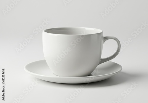 © Vooglo.com, Obraz premium A simple studio shot showcasing a white ceramic cup sitting on a matching white ceramic saucer plate