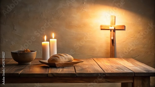 © Jane Studio, Naklejka premium A Simple Table Setting with Lit Candles, Bread, and a Wooden Cross in the Background
