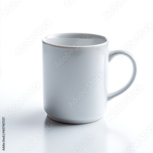 Fototapeta premium A simple, white ceramic coffee mug, empty, isolated on a pure white background. Beverage, simple.