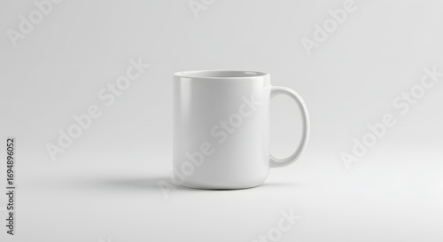 Fototapeta premium A simple white ceramic mug with a handle on a plain white surface in a studio setting for presentation
