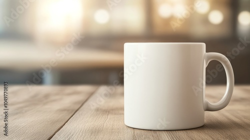 © GreenMOM, Fototapeta premium A simple white mug on a wooden table, perfect for showcasing drinks or elegant coffee moments in a cozy setting.