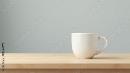 © napak, Fototapeta premium A simple white mug rests on a light wood surface against a muted background, conveying tranquility and a sense of quiet contemplation.