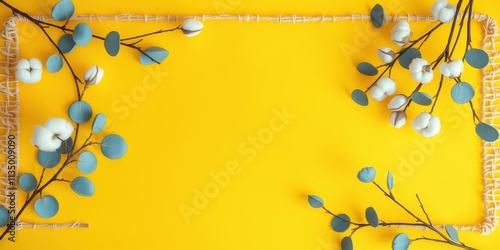 Fototapeta premium A Simple Yet Elegant Arrangement of Cotton and Eucalyptus Branches on a Vibrant Yellow Background
