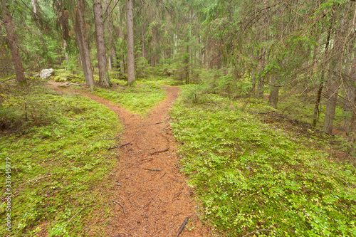Fototapeta premium A single alpine path splits in two different directions. It's an autumnal...