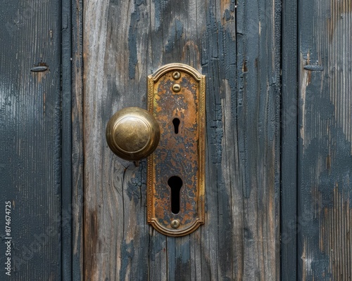 Fototapeta premium A single antique brass doorknob on a weathered wooden door