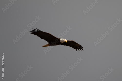 © John, Fototapeta premium A single Bald Eagle circling in the sky searching for food.