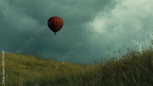 Obraz premium A single balloon against a stormy sky, floating over scenic rolling meadows. No people.