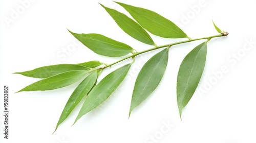 Fototapeta premium A single bamboo leaf, long, narrow, and slightly arching with a bright green hue