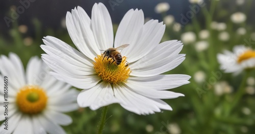 Fototapeta premium A single bee collecting pollen from a white cosmos, insect, blossom