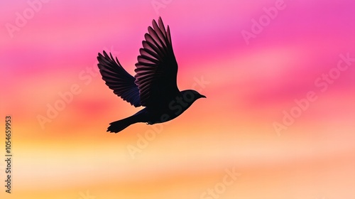 Fototapeta premium A single bird flies against a vibrant pink and orange sunset sky.