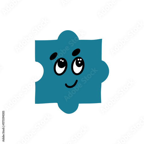 © Elen_Si, Obraz premium A single blue puzzle piece with a friendly cartoon face. Perfect for projects related to puzzles, problem-solving, childhood, and games.