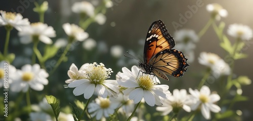 Obraz premium A single butterfly perched on a small white flower or blossom with gentle...