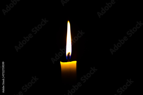 Fototapeta premium A single candle glows brightly in the darkness, its warm flame casting light and creating a peaceful, solemn, and intimate atmosphere.