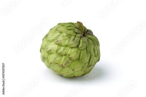 © Zahra, Fototapeta premium A single cherimoya fruit, green and textured, sits against a bright white background.