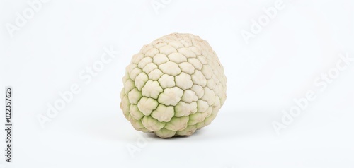 © kamon, Fototapeta premium A single cherimoya fruit with a textured, scaly surface, isolated on a white background. Perfect for illustrating exotic fruit varieties.