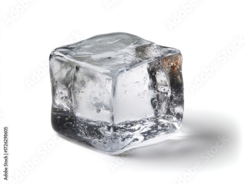 Obraz premium A single clear ice cube with bubbles inside sits on a white background,...